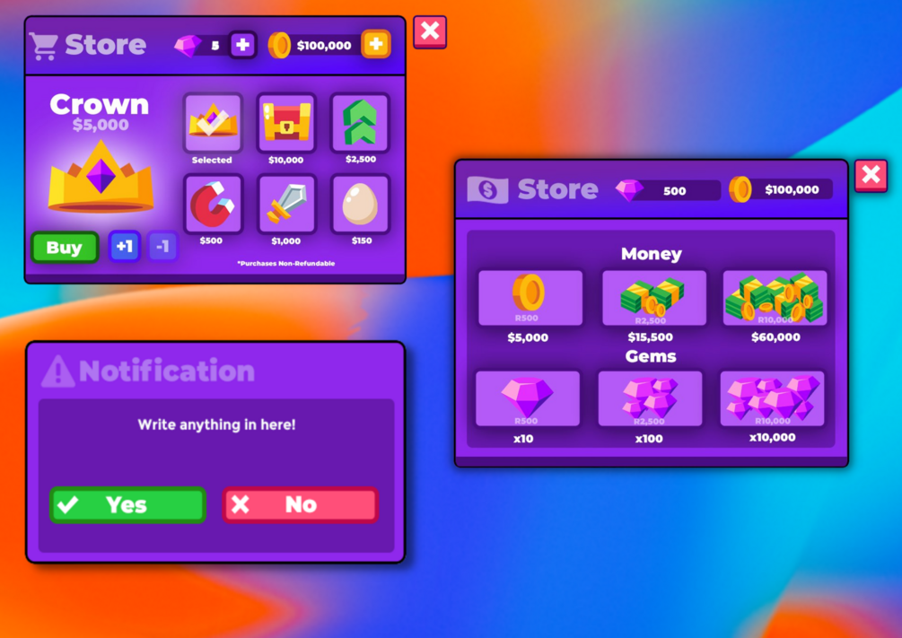 It's quick, simple, and inexpensive!  With a premade UI, you receive 4 frames of premium quality Roblox UI for a fraction of the cost of a custom UI - literally, it's multiple times less expensive than a custom a UI. There are 3 frames in all (Notifications has 2 Variants!) , which you can view above.  It won't be unique – for that, you'll need a custom UI – but if you're on a budget, this will do.